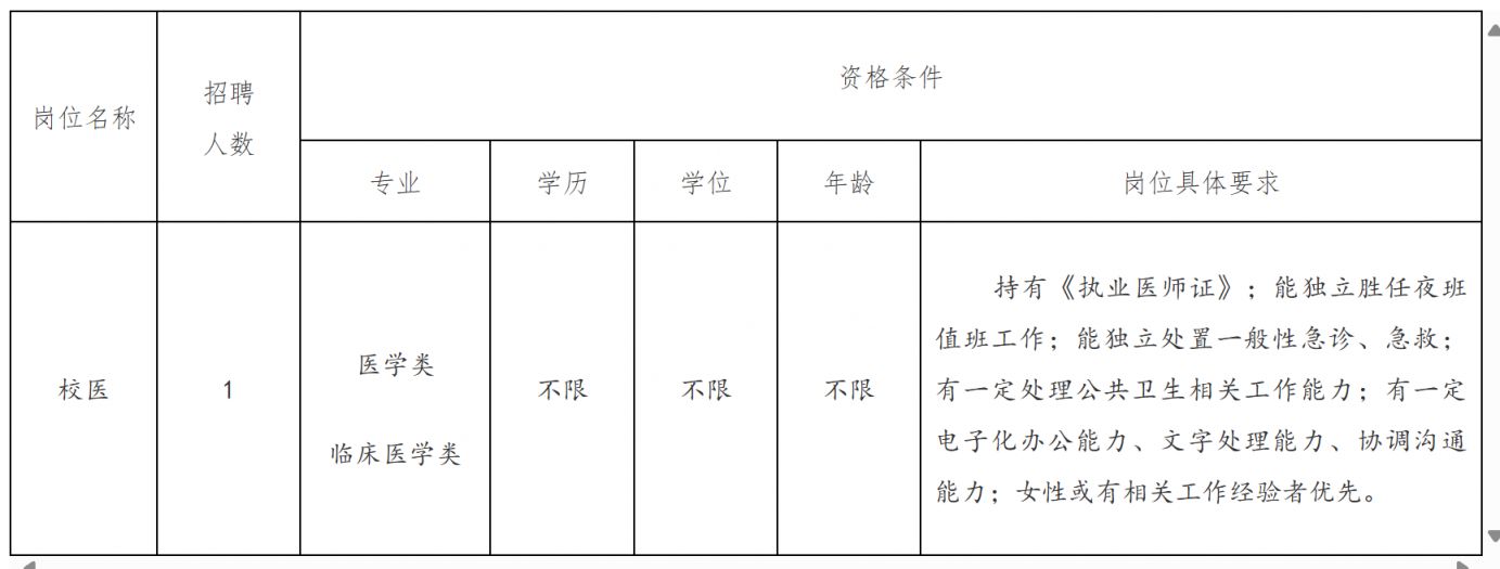 持有《执业医师证》;能独立胜任夜班值班工作;能独立处置一般性急诊、急救;有一定处理公共卫生相关工作能力;有一定电子化办公能力、文字处理能力、协调沟通能力;女性或有相关工作经验者优先。